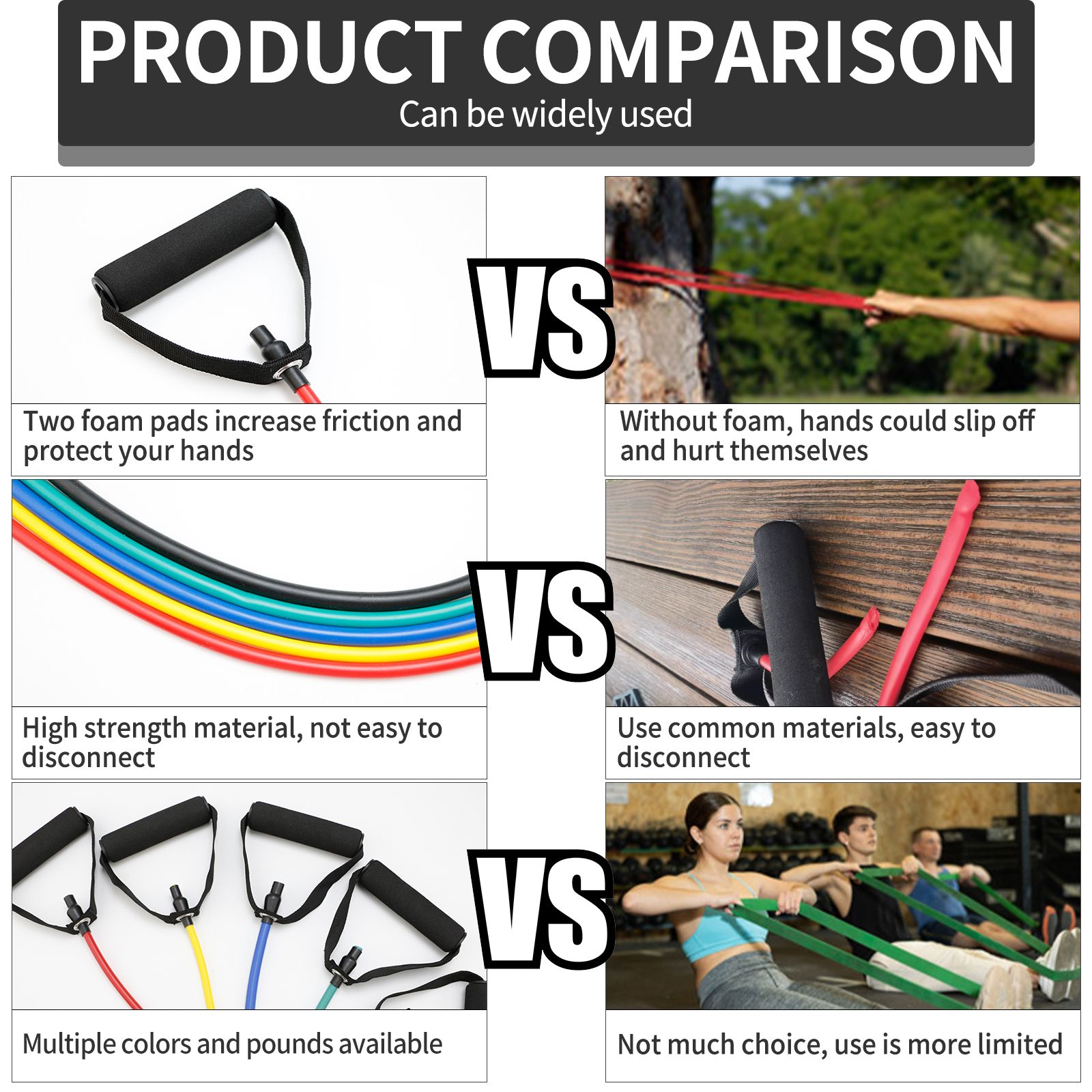 3.3. High quality latex resistance tubes: Made of natural latex, our resistance bands are stackable, irritation-free and odor-free, making them the perfect choice for your health, fitness and performance. Single resistance band: length 4 feet. Friendly to the environment. Strong wear resistance, large elasticity, non-slip handle, comfortable and absorbent.