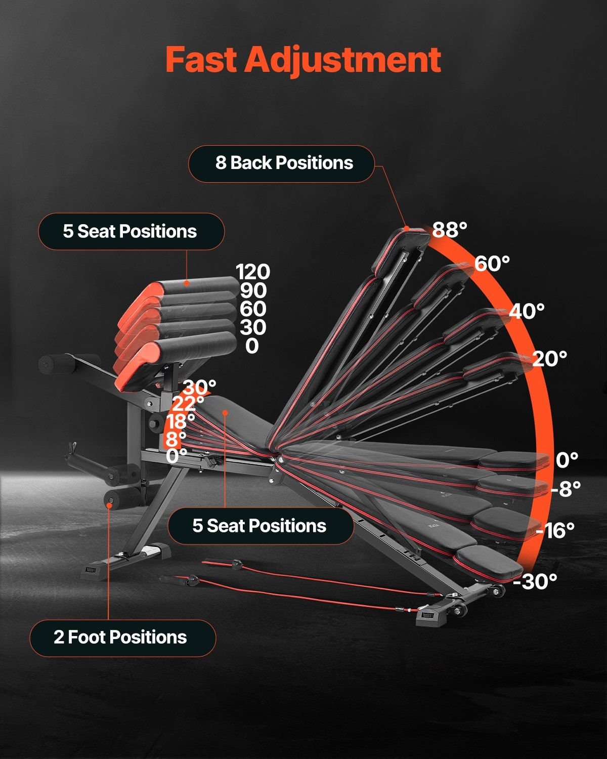 2.Adjustable and Multi-purpose: This adjustable strength training bench features 8 back positions, 5 seat positions, and 2 footrest positions. By simply pulling the quick-release bolts, you can adjust to your preferred position, which will automatically lock into place. It allows full flexibility to strengthen and work all muscle groups